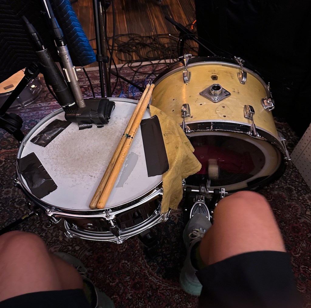 However, in my last visit to Earthling, Mike and I tried another approach: isolating the kick and snare from the cymbals and hi hat. That is, we erected a little fort around the kick and snare and recorded them on their own, then recorded cymbals and hi hat separately later.